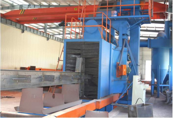 該機型適用于大型重鋼結構件的表面處理,利用高速的彈丸束打擊在工作表面上,將其表面的氧化皮、銹蝕層、焊渣及污物清除,獲得一下粗糙度的光潔表面,提高漆膜與鋼格表面的附著力,消除工作內應力,提高鋼材的抗疲勞強度和抗腐蝕能力,延長其使用壽命中。